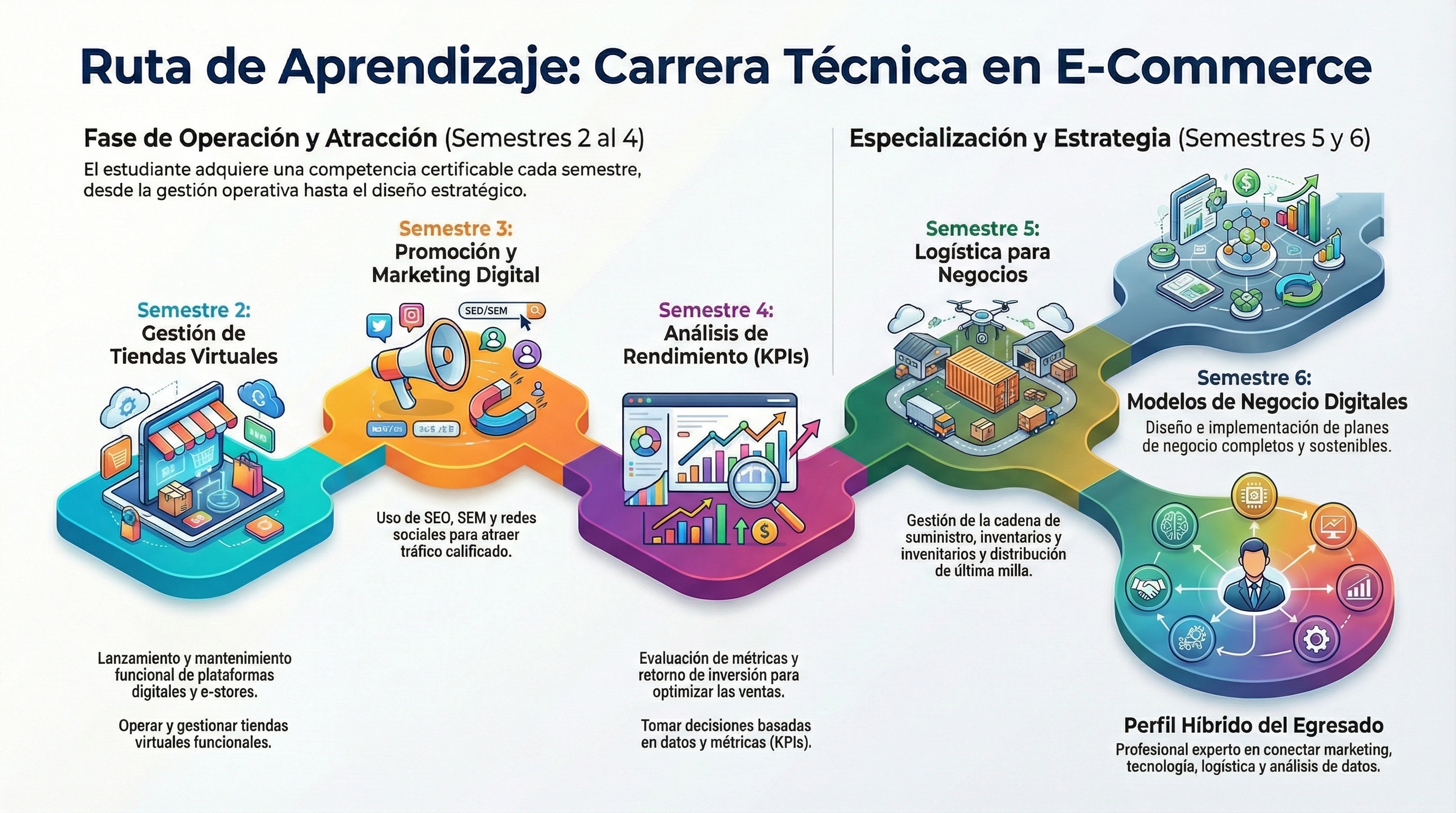 La carrera de Técnico en E-commerce responde a la creciente demanda del mercado global por profesionales capaces de digitalizar procesos comerciales. Este programa de formación técnica prepara a los estudiantes para diseñar, gestionar y optimizar modelos de negocio en el entorno digital, combinando habilidades tecnológicas con visión estratégica de mercado.