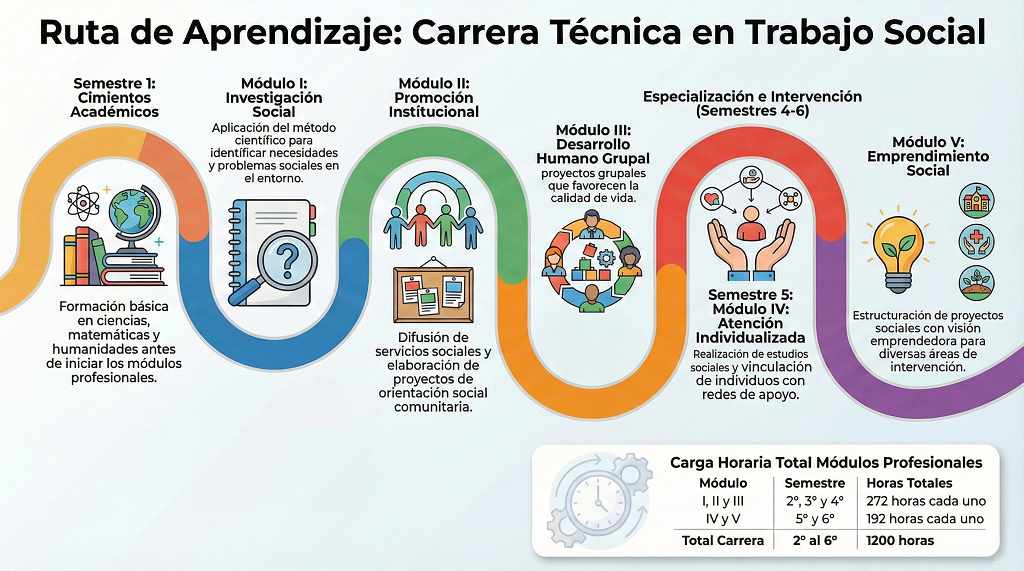 La carrera de Técnico en Trabajo Social es una formación profesional técnica orientada a la aplicación de programas sociales que busquen el beneficio de la población y la reducción de problemáticas sociales. Su enfoque principal radica en generar procesos de prevención y atención en los niveles individual, familiar y comunitario.